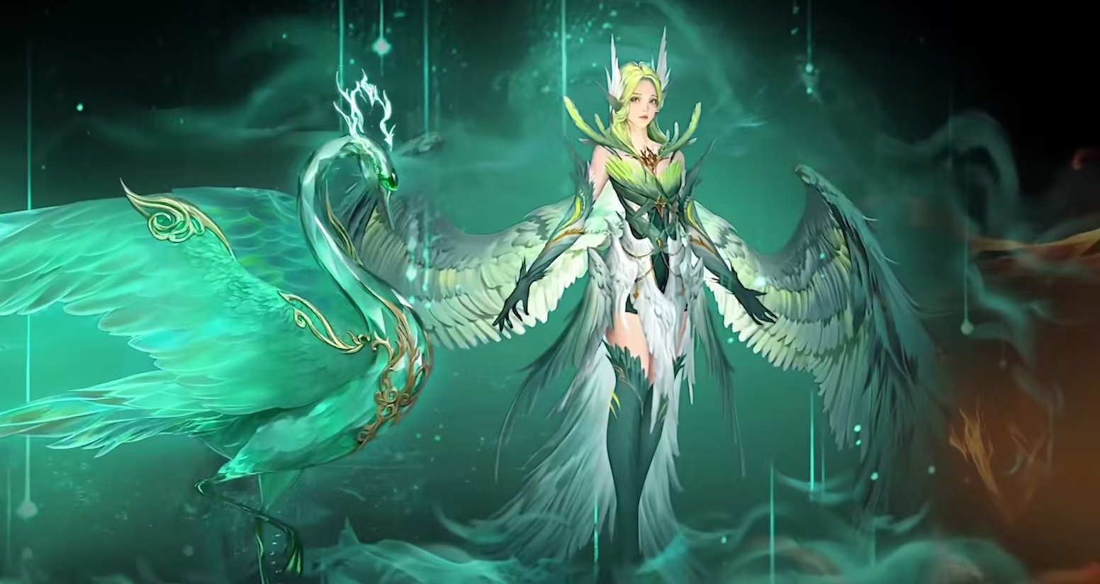 可以看到画面中碧姬一身绿色衣裙,容貌艳丽,身材性感,更是有着一双绿色的翅膀。而注意看还能发现,在她的身边有着一只绿色的天鹅。而这就是她的本体了,也就是翡翠天鹅。很多人开始不知道她的身份,但是当看到翡翠天鹅之后,便知道她的身份了。